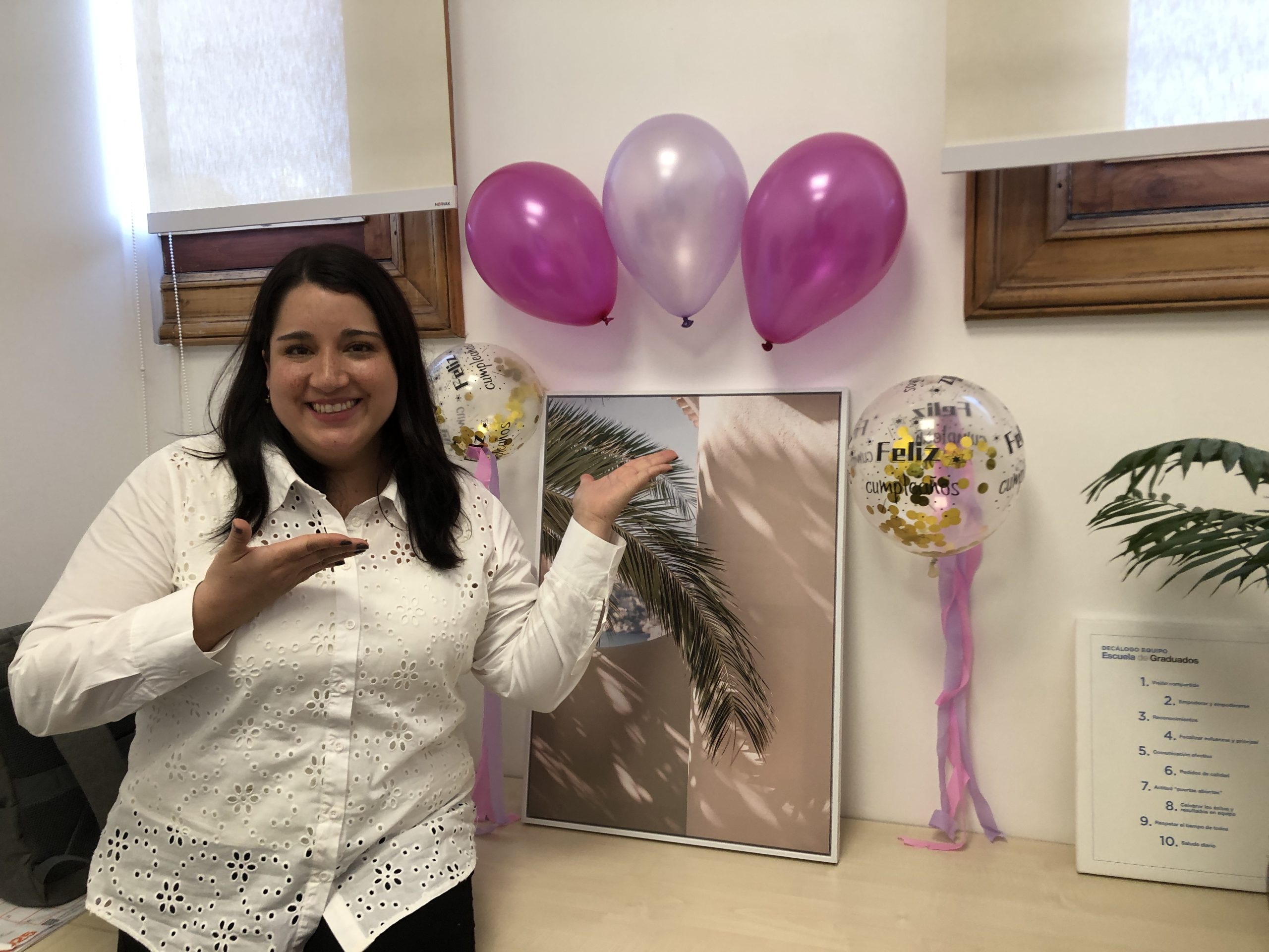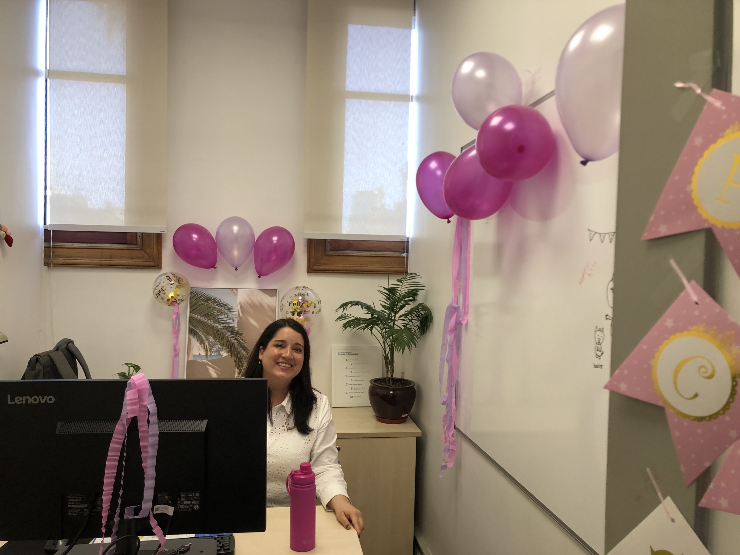 Globos, serpentinas y un cartel de “Feliz Cumpleaños”, así recibió Bárbara Rivera a su compañera de Escuela de Graduados, Marcela Caroca. cuando llegó a trabajar después de tomarse un día por su cumpleaños.