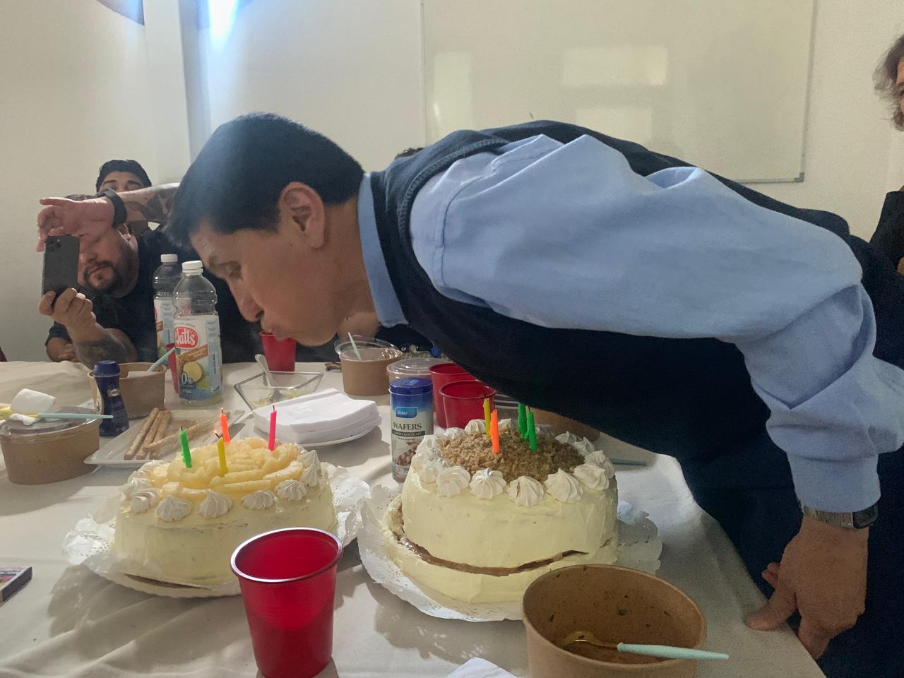 ¡Doble torta! ¡Siii! De piña y nuez son las que pudieron compartir nuestros queridos vrisionarios y vrisionarias de Casa Central, todo por motivo de la celebración del cumpleaños de Bernardo Cabello y la despedida de Mariana Castro, de la Dirección Ejecutiva.
